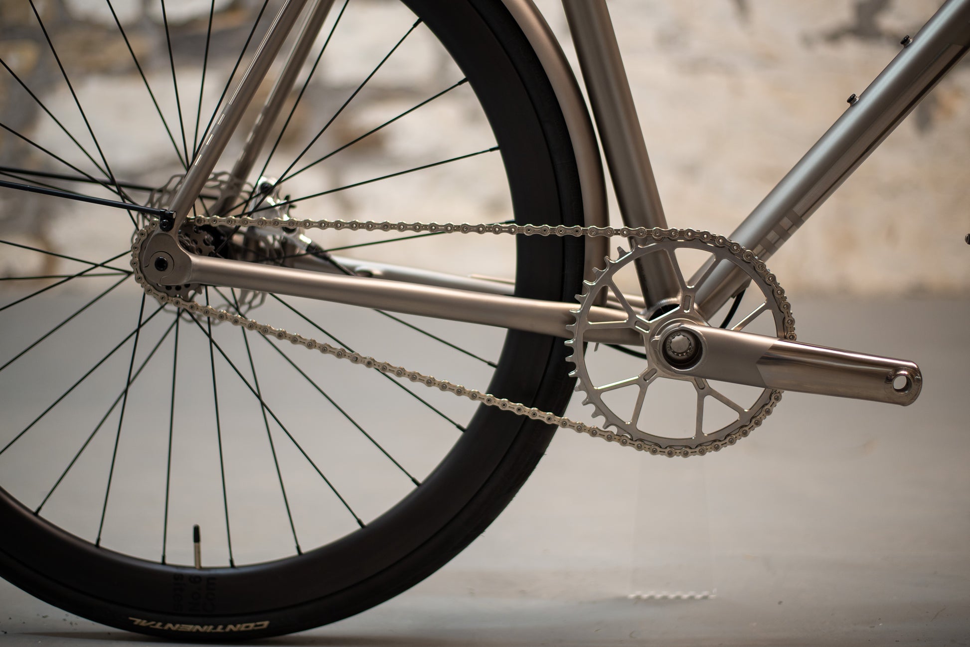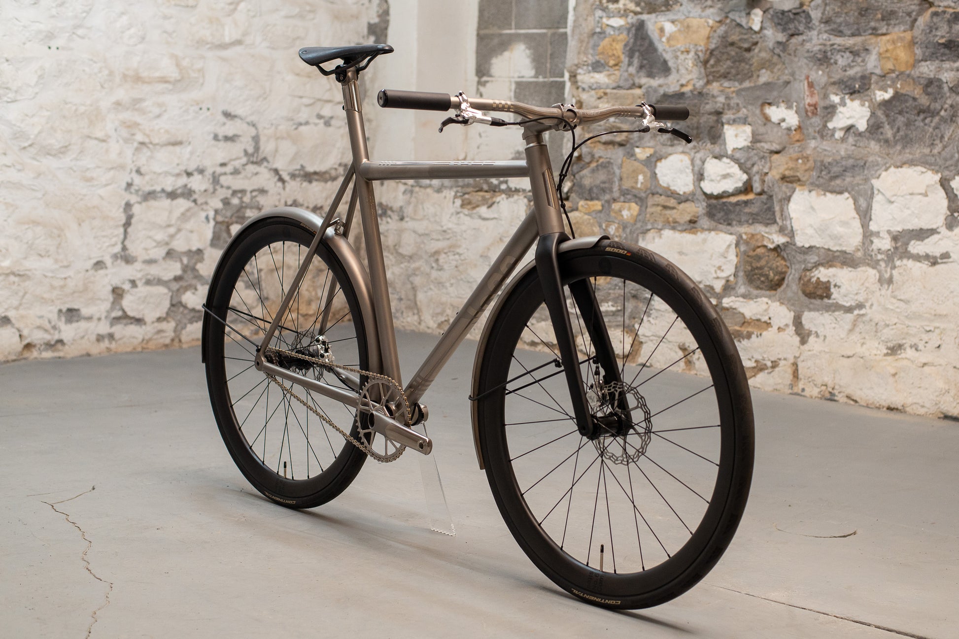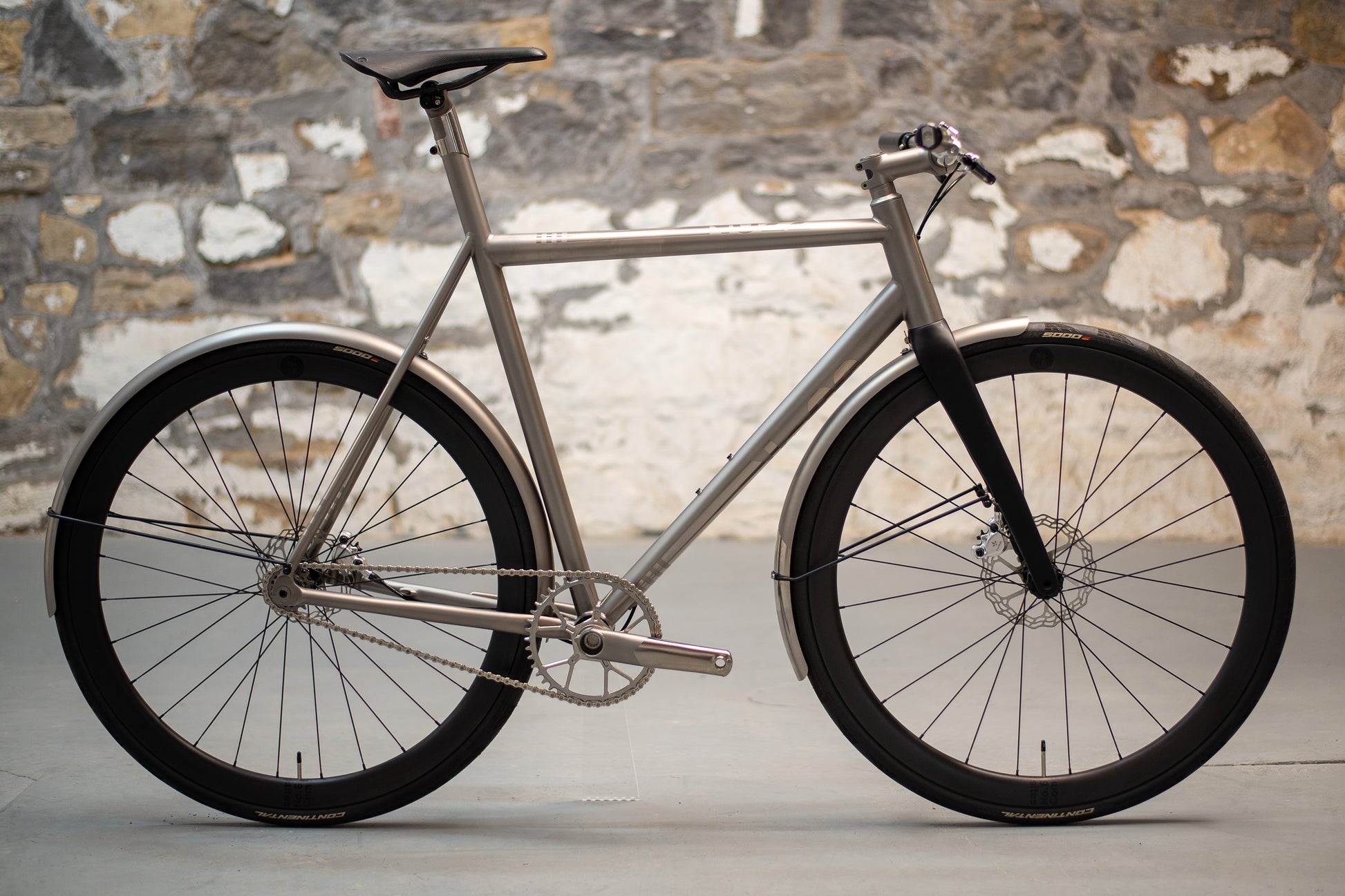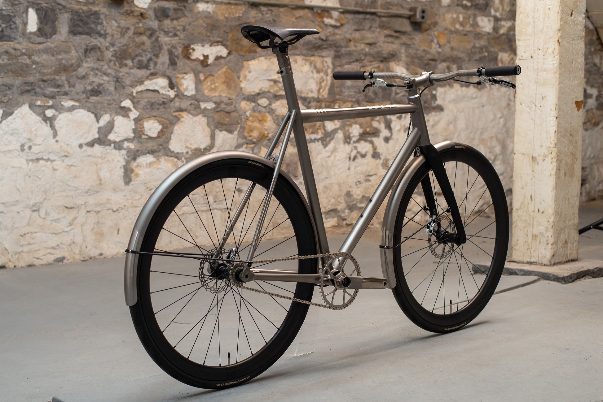 The frame is finished in our High Polish titanium finish and is paired with a number of bespoke components and custom touches. It features our titanium fenders, custom finished Thomson titanium flat handlebars, Cane Creek eeWings titanium cranks, and DWARD chainring, all finished to closely match the polished titanium frame. The result is a cohesive and striking build that highlights both craftsmanship and creativity.