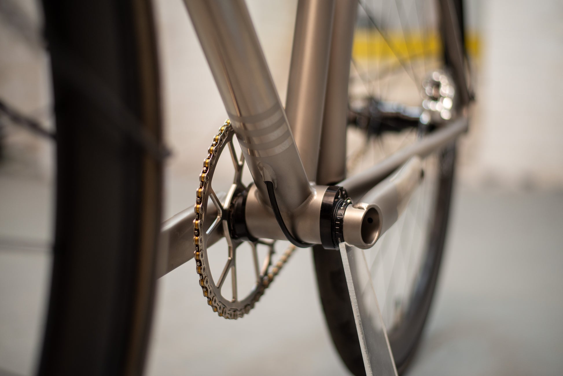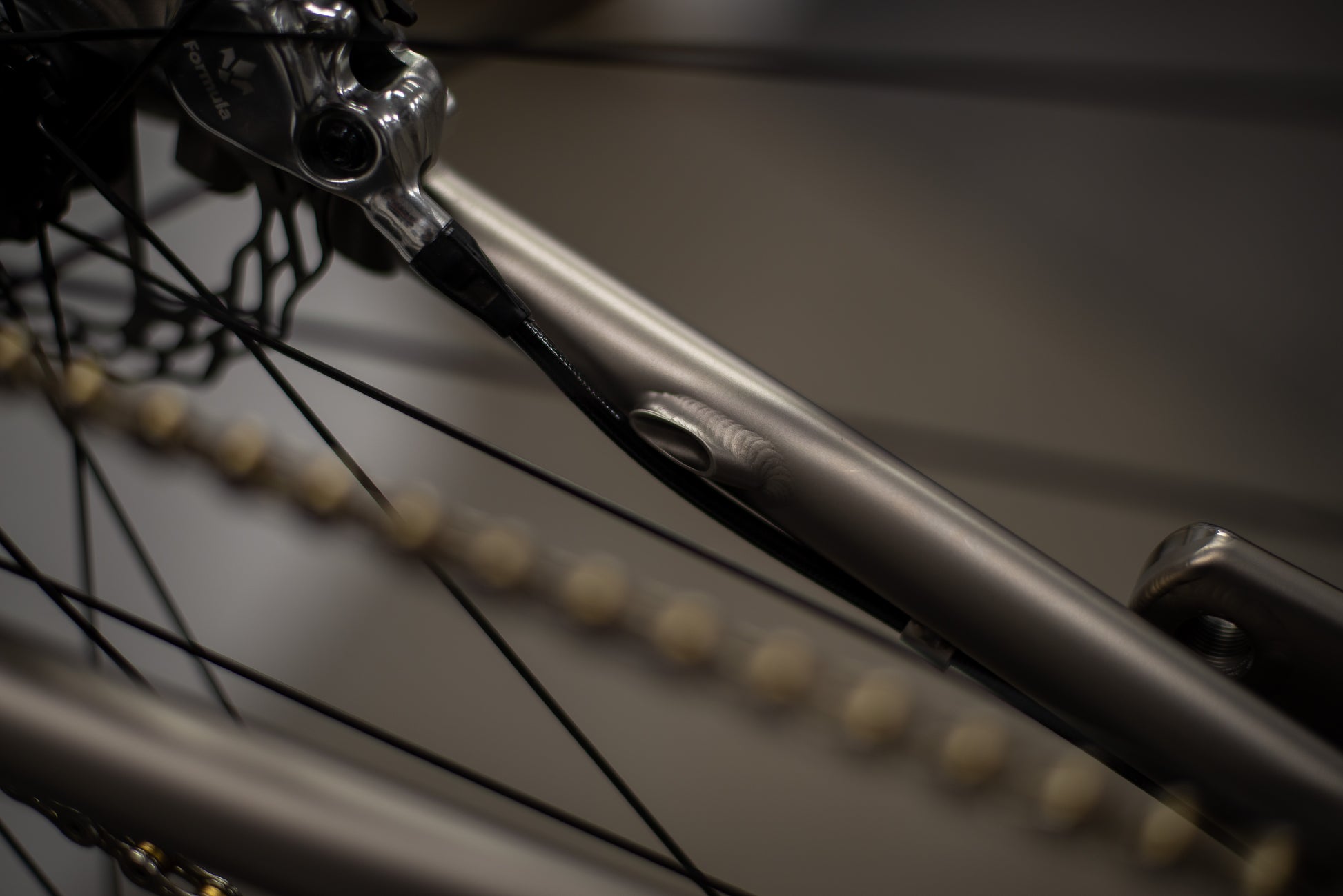 This bike also includes a unique technical detail. The rear brake hose was originally designed to route fully internally through the bottom bracket shell and chainstay. During assembly, we determined that there was insufficient clearance within the bottom bracket shell when paired with the eccentric bottom bracket to safely route the hydraulic hose. To resolve this, a discrete brake hose port was added to the downtube just ahead of the bottom bracket shell, with the hose continuing externally along the underside of the non drive side chainstay. This solution preserves braking performance and long term reliability while maintaining a clean aesthetic.